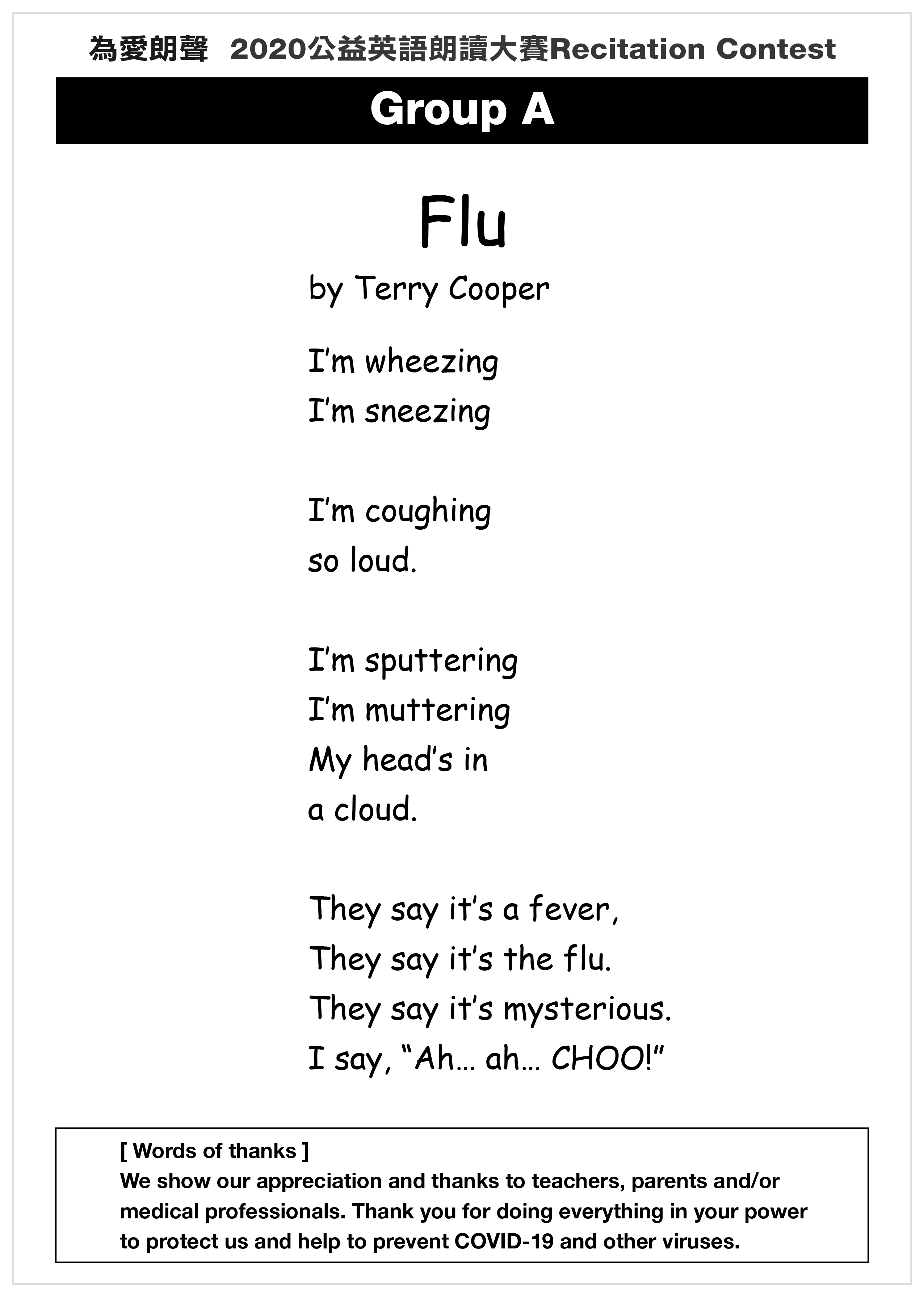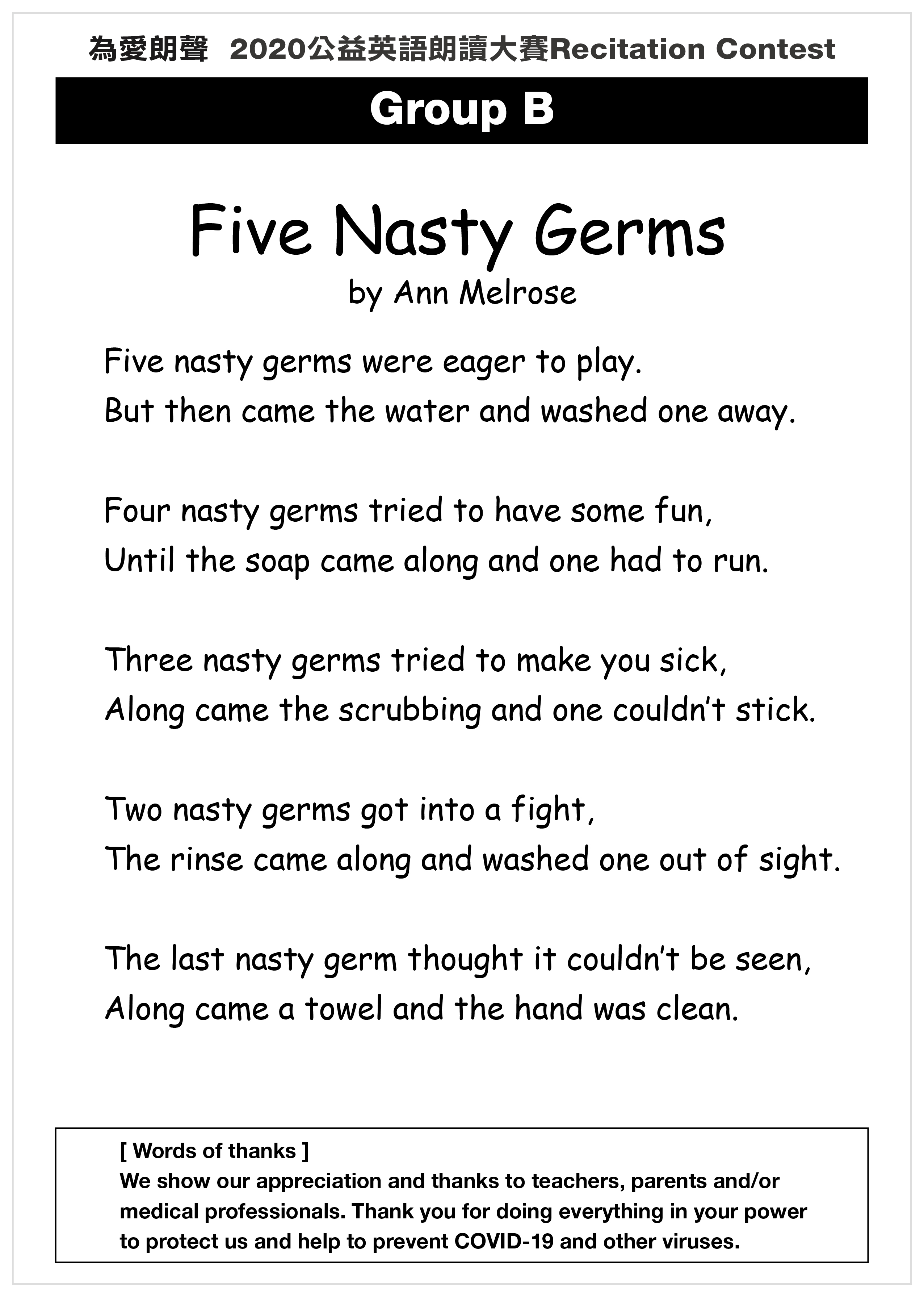 參賽者須朗讀指定文章,文章下載→ Group A - 低年級組、 Group B - 中年級組、 Group C - 高年級組 |