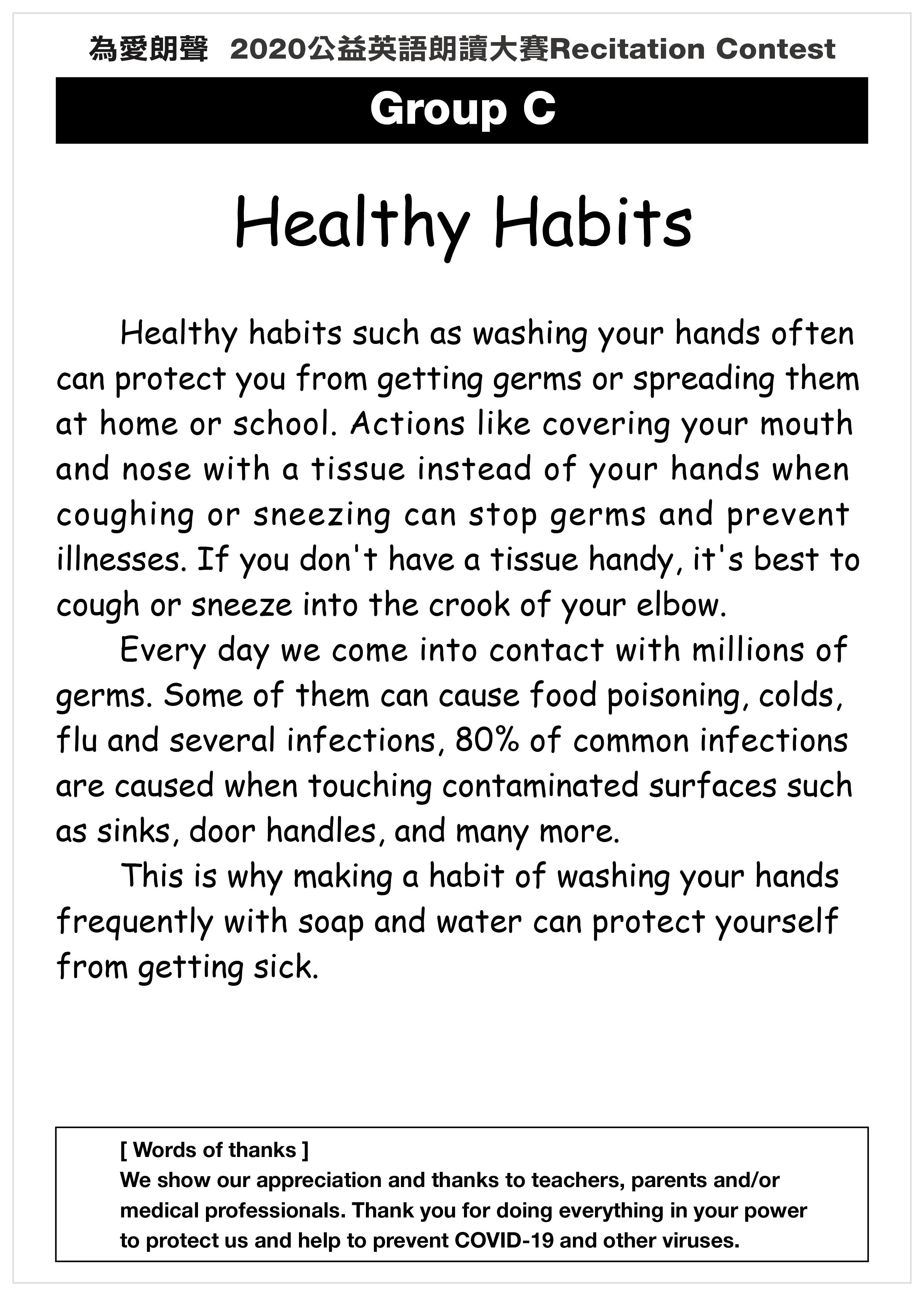 | 3. | 參賽者不得報校名,僅報「英文名字」與「朗讀題目」即可。如:I am Jenny. I am going to read “Healthy Habits.” |